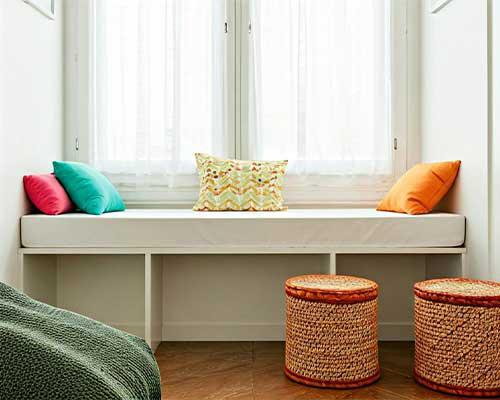 Install a floating bench with storage below, or create a raised platform, to find solace as you dive into the depths of a good book. Paint the walls in soft pastels and layer the seating with throws and cushions for added comfort.